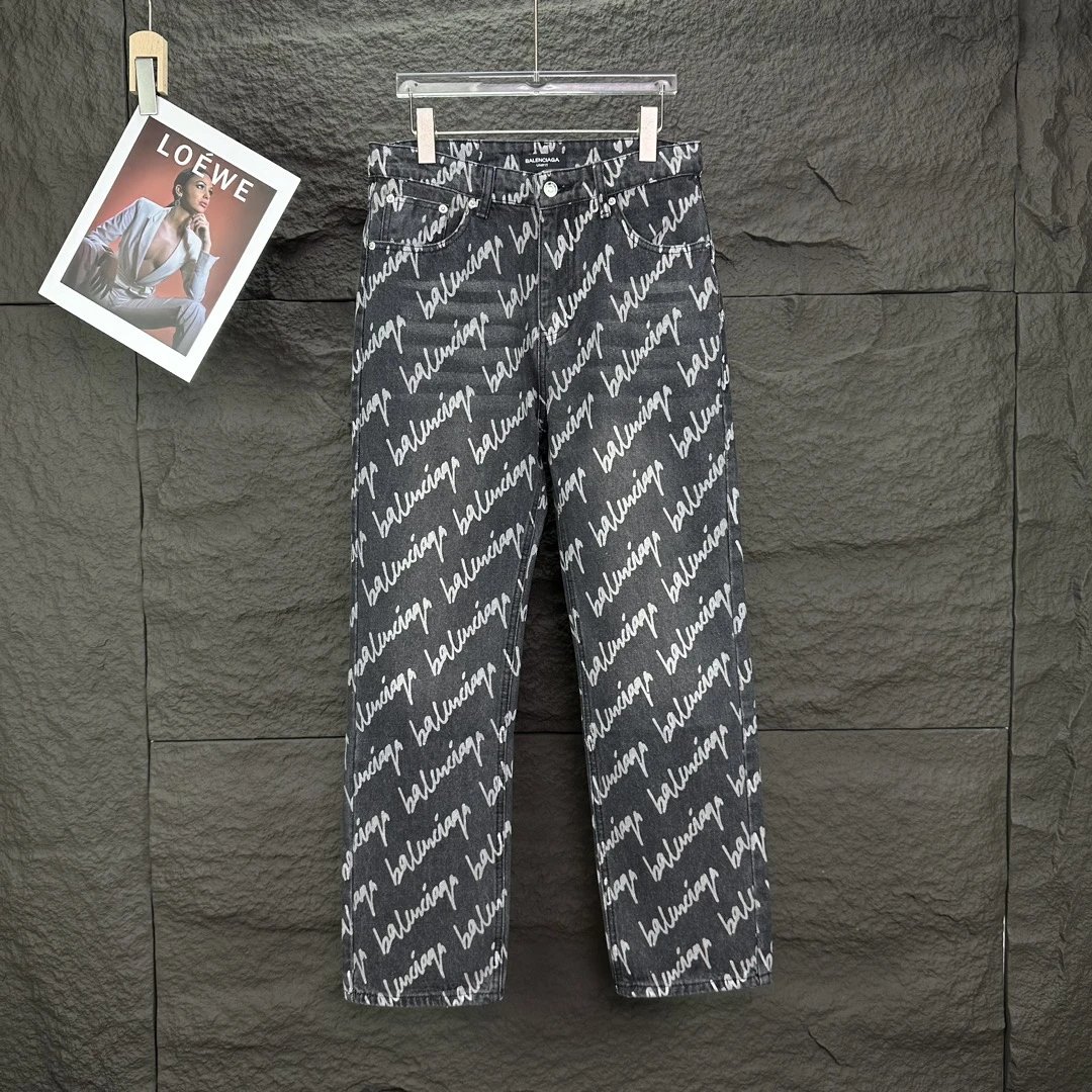 Balenciaga 2024 New Arrival Couple’s Washed Jeans feature all-over prints for stylish individuality. Pair them with your significant other for sophisticated matching outfits!