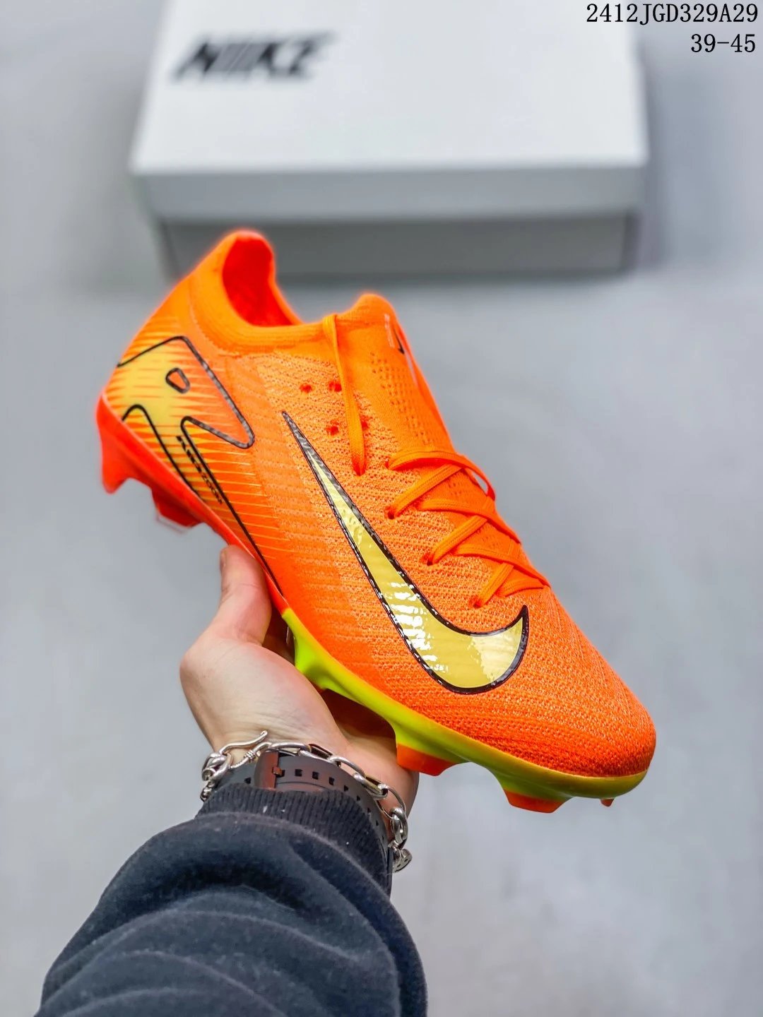Nike Vapor15 Academy Mercurial Dream Speed. These men’s synthetic turf soccer training shoes let you fly across the field! Air Zoom cushioning in the heel delivers exceptional support, helping you break through defenses with ease. The responsive cushioning lets you control the game’s tempo—speed up when you want, slow down when you need. Put them on and feel your competitive spirit ignite—give it your all and dominate your own turf! The distinctive midfoot pattern symbolizes those pivotal moments when you confidently push past your limits. The vibrant heel design keeps you focused: blue helps you reach peak performance, orange boosts your concentration and creativity, while metallic accents represent goals and victory! The NikeSkin upper with V-shaped texture delivers unmatched ball control and an incredible feel. The outsole’s specialized studs combined with Air Zoom cushioning deliver exceptional traction. Custom-engineered studs make sudden stops and directional changes effortless. Crafted entirely from synthetic materials, the shoe offers flexibility with support, providing top-notch ball control—perfect for artificial turf. The cushioned insole ensures ultra-comfortable runs!