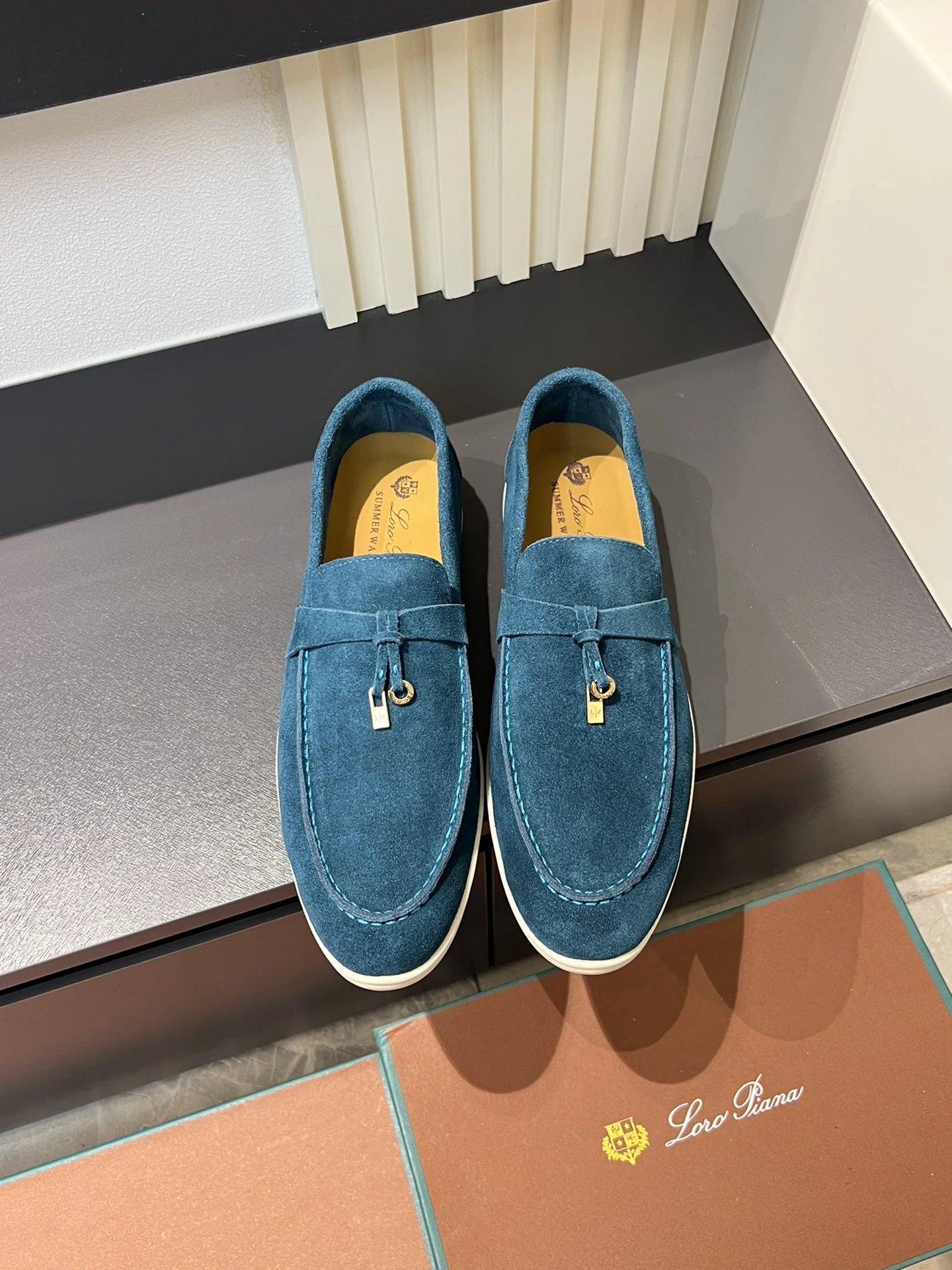 Check this out! Loro Piana’s classic flat loafers in lake blue—slip them on and you’ll be the epitome of style!