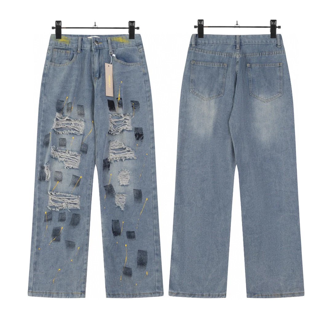 FOG High Street Destroyed Knife-Cut Straight-Leg Jeans with Ripped Patches, Distressed Wash, and Frayed Hem stand out for their distinctive FOG streetwear aesthetic. This piece showcases knife-cut rips and a classic, fashion-forward straight-leg silhouette. Thoughtfully placed fabric rips and patchwork elements seamlessly blend vintage inspiration with washed techniques, crafting an edgy, grungy appearance. This design not only embodies individuality but also remains at the cutting edge of fashion trends.